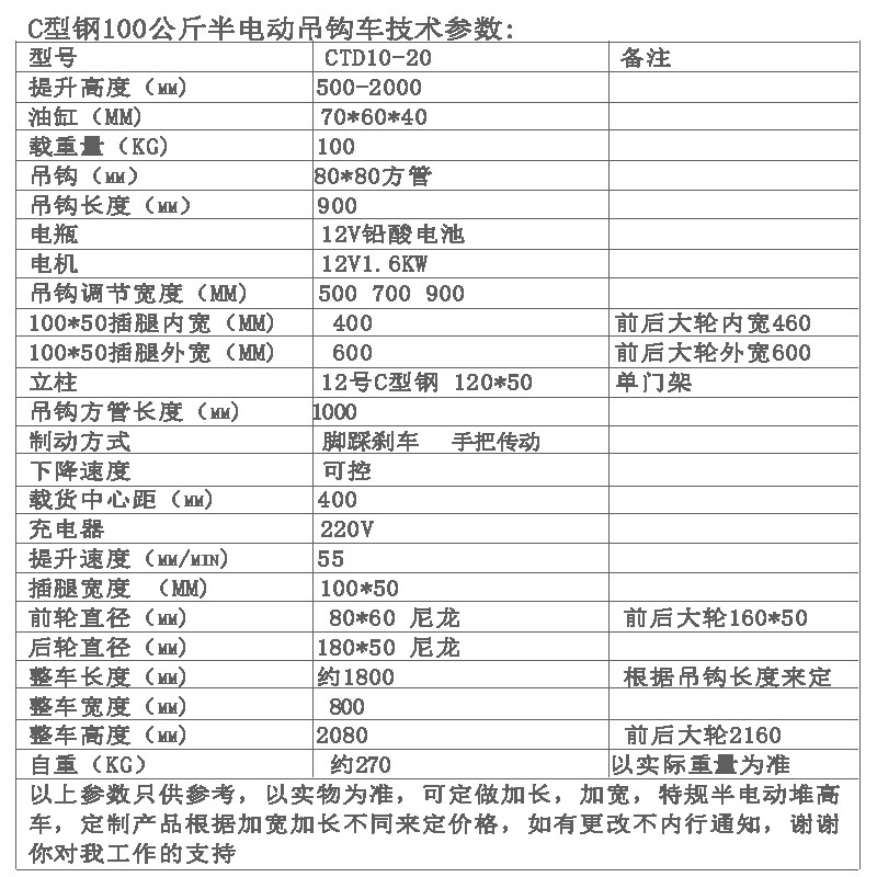 提升2米100公斤短支腿腿配重式大轮半电动吊钩堆高车升降手推行走